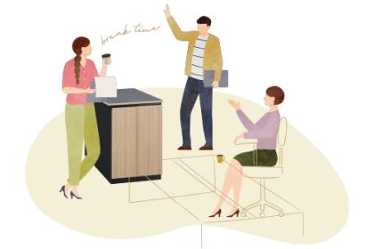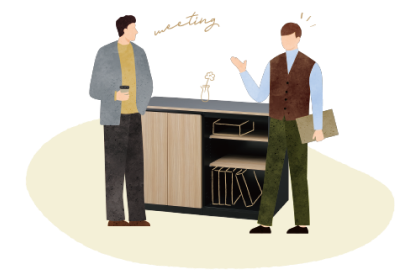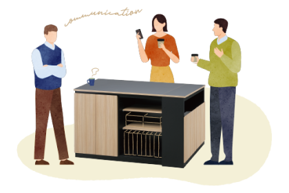 世代や部署を超えた社員が集まり、自然な会話や交流を通じて創造性を刺激する空間を提供します。